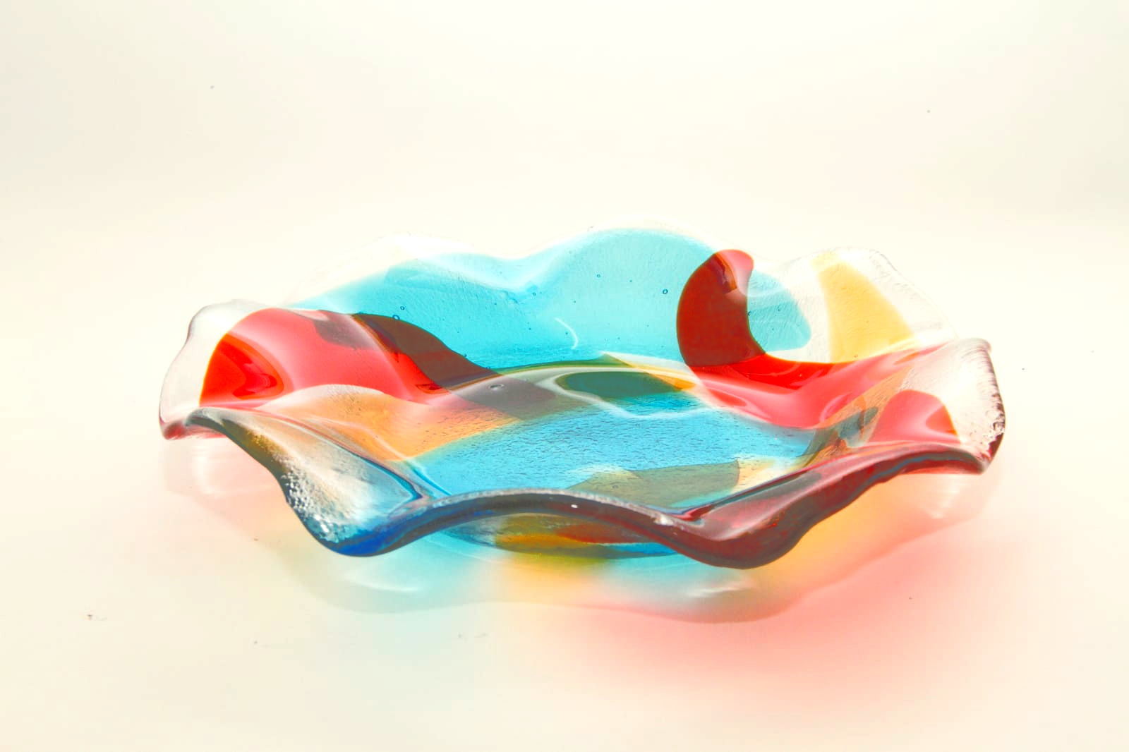 חומר הגלם איתו אני משתמשת הוא שבבים של זכוכית המייצרים שלם חדש וססגוני, משחק של צבעים ומרקמים, אותם אני משלבת בווריאציות שונות של התכה בתנור בטמפ' גבוהה מאוד עד למוצר הסופי שהוא נעים לעניים.